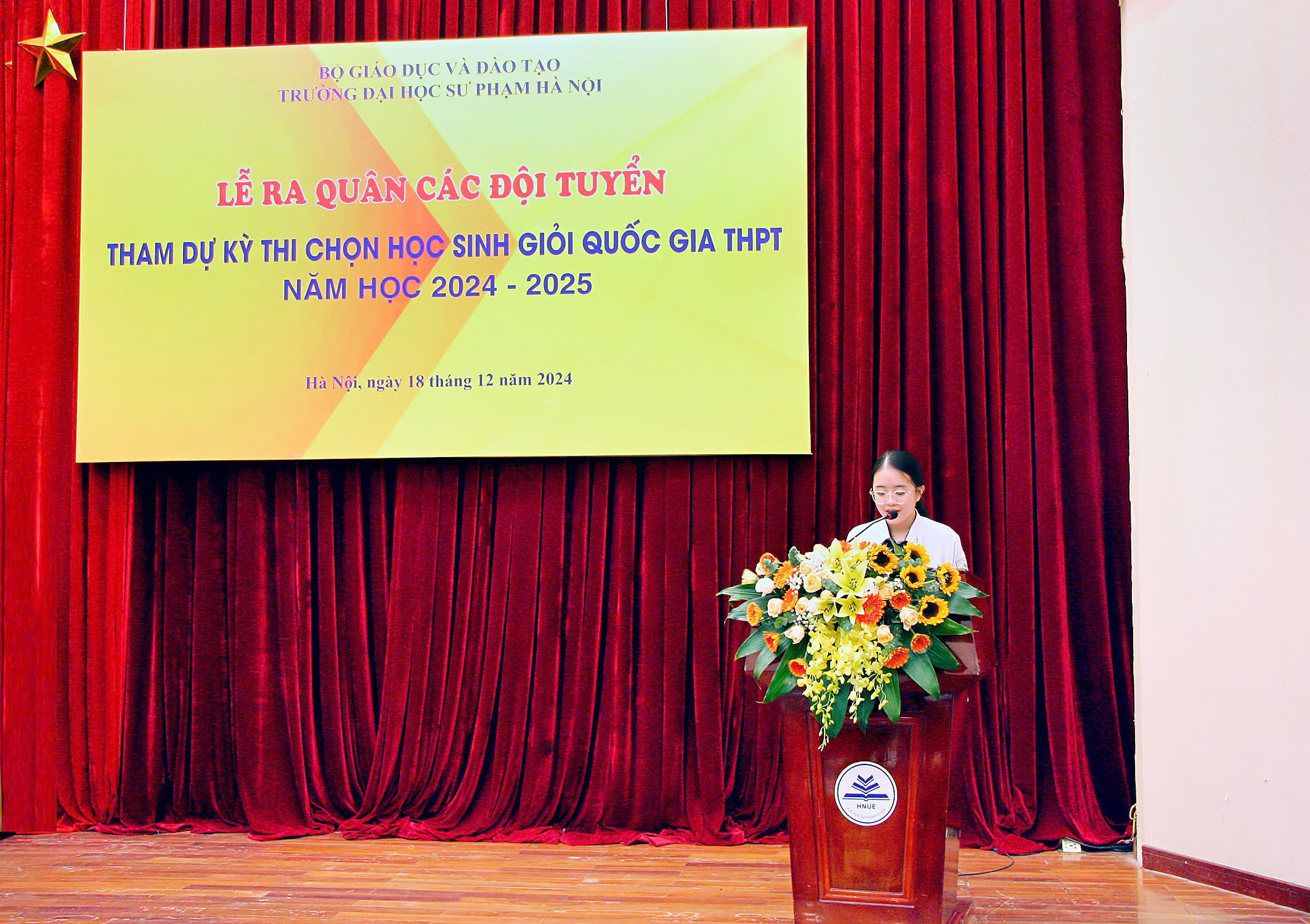 Thay mặt 80 học sinh, em Nguyễn Thị Thảo Nguyên – thành viên đội tuyển Sinh học đã phát biểu cảm ơn tới Nhà trường, các thầy cô giáo, cha mẹ học sinh và các nhà tài trợ đã đồng hành và hỗ trợ các đội tuyển trong suốt chặng đường chuẩn bị. Em Nguyên cũng chia sẻ sự quyết tâm và nỗ lực hết mình của các đội tuyển để hoàn thành bài thi một cách xuất sắc.