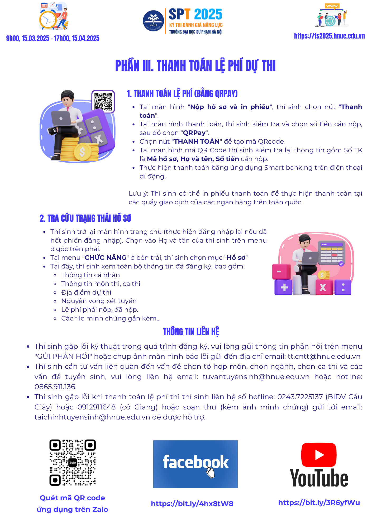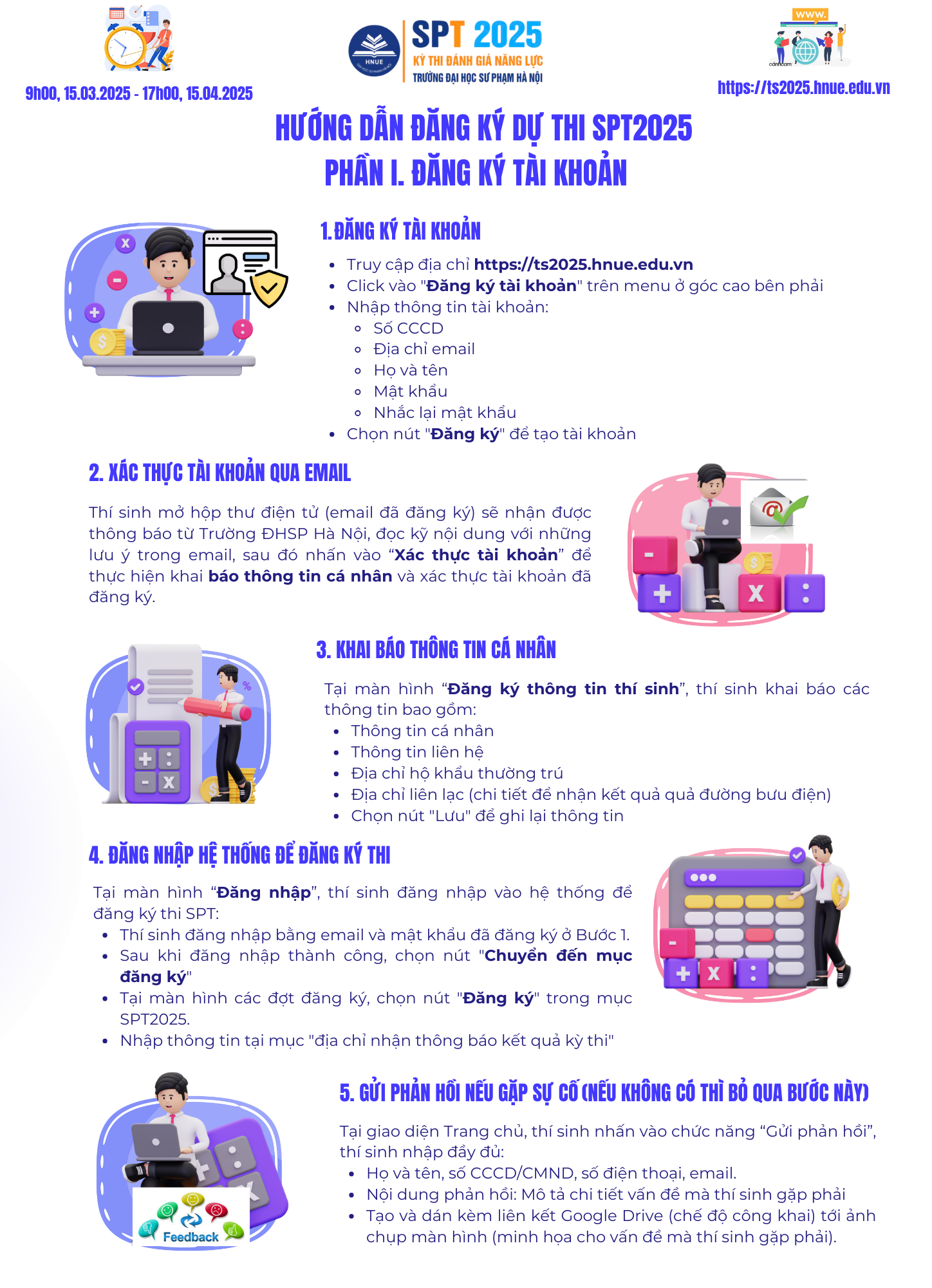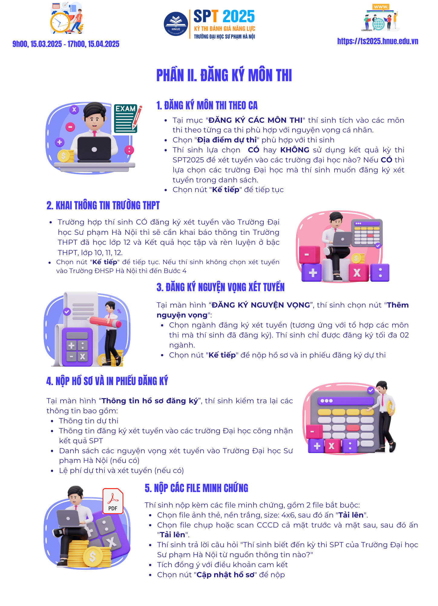 Hệ thống đăng ký tham dự kỳ thi đánh giá năng lực năm 2025 - SPT 2025 của Trường Đại học Sư phạm Hà Nội sẽ chính thức MỞ CỔNG lúc 9h00, Thứ Bảy, ngày 15-03-2025 đến 17h00 ngày 15-04-2025. Sau đây là thông tin hướng dẫn các bước thực hiện đăng ký.