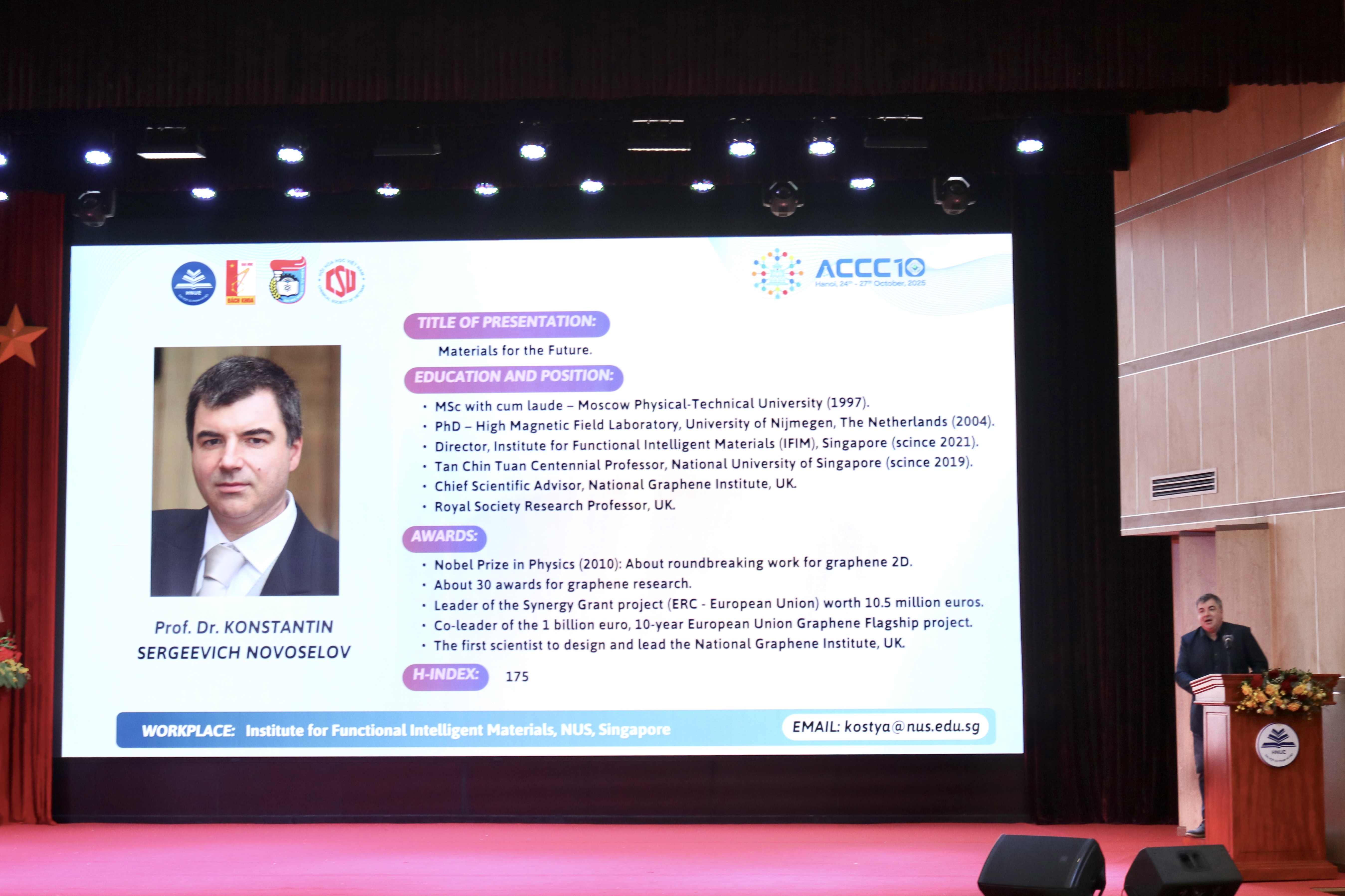 Trong khuôn khổ Hội thảo Phức chất Châu Á lần thứ 10 (ACCC10), sáng ngày 25 tháng 10 năm 2025, GS. Konstantin (Kostya) S. Novoselov – Đại học Quốc gia Singapore (NUS), Singapore, (đạt giải Nobel Vật lí năm 2010) đã diễn thuyết về Vật lý Vật chất Ngưng tụ, Graphene và các vật liệu hai chiều, Cấu trúc Nano và Chế tạo Nano (Condensed Matter Physics; Graphene and Two-Dimensional Materials; Nanostructures and Nanofabrication) tại Trường Đại học Sư phạm Hà Nội. Ngay sau đó, GS Konstantin (Kostya) S. Novoselov đã có buổi làm việc, trao đổi chuyên sâu hơn với Trường Đại học Sư phạm Hà Nội.