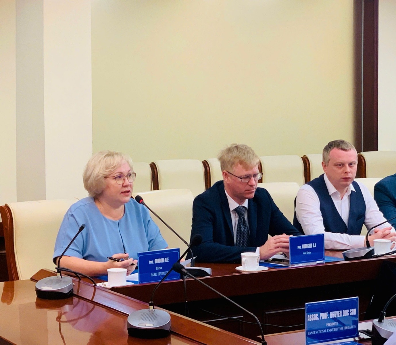 Đại diện cho ĐH Ivanovo State University of Chemistry and Technology, GS. Gordina Natalia Evgenievna, Hiệu trưởng ISUCT gửi lời cảm ơn sâu sắc tới trường ĐHSP Hà Nội vì sự đón tiếp trọng thị và chu đáo. Bà cho biết Đại học ISUCT có lịch sử hơn 100 năm hình thành và phát triển, là một trong những trung tâm nghiên cứu hàng đầu của Liên bang Nga trong lĩnh vực hóa học và công nghệ. Hiện trường có 4 tạp chí khoa học nằm trong danh mục Scopus, duy trì các hội đồng bảo vệ luận án được công nhận ở cấp quốc gia, và đặc biệt sở hữu đội ngũ các nhà khoa học nằm trong Top 2% thế giới theo xếp hạng của Stanford University. Giáo sư Natalia đề xuất bốn hướng hợp tác có thể triển khai trong thời gian tới giữa hai Nhà trường.