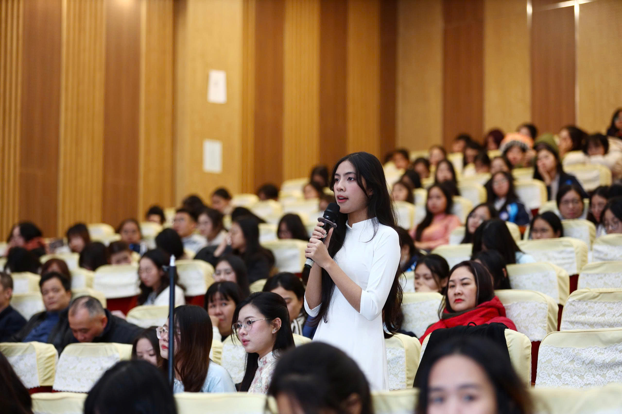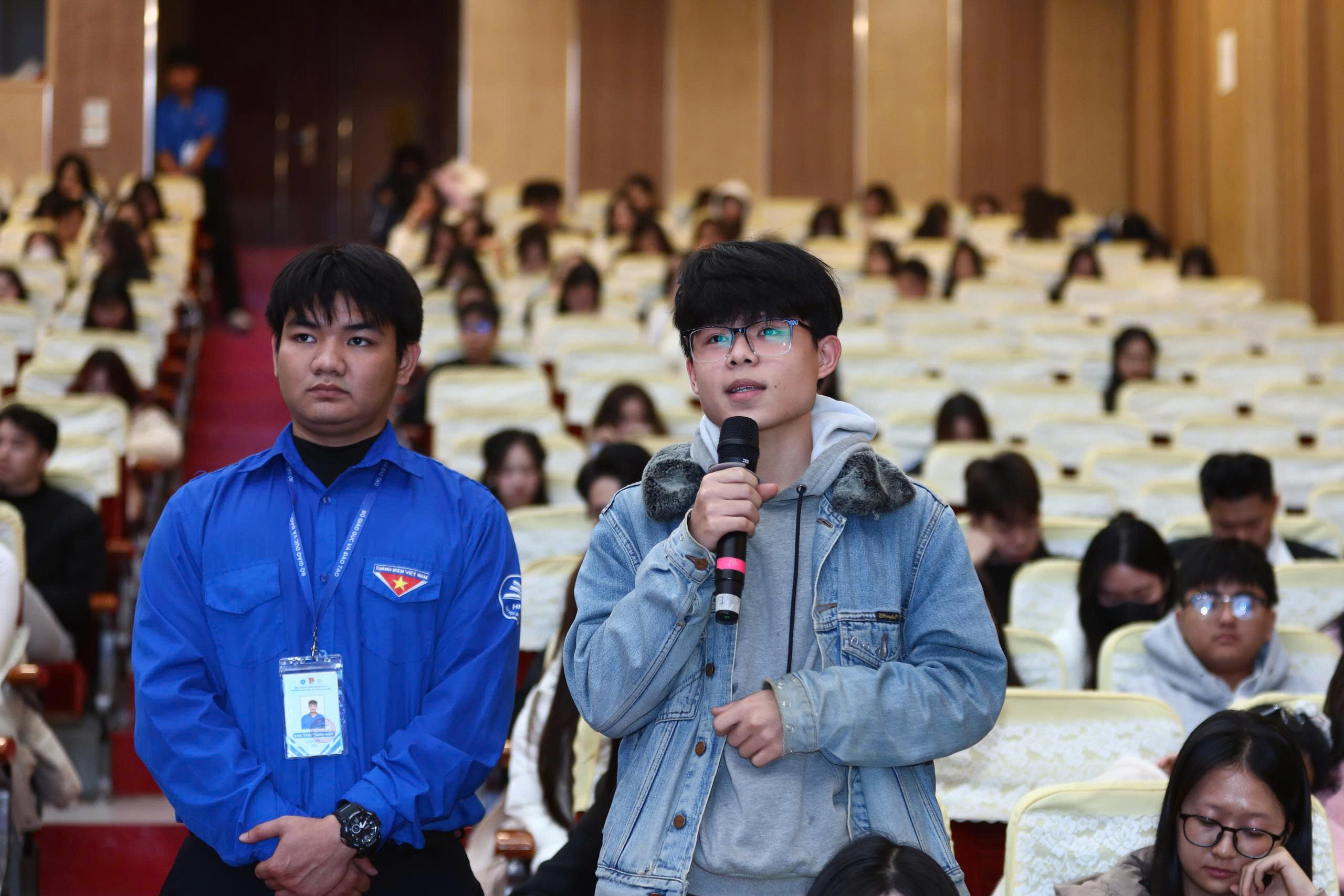 Ảnh 3. Sinh viên đặt câu hỏi với lãnh đạo Nhà trường tại Hội nghị