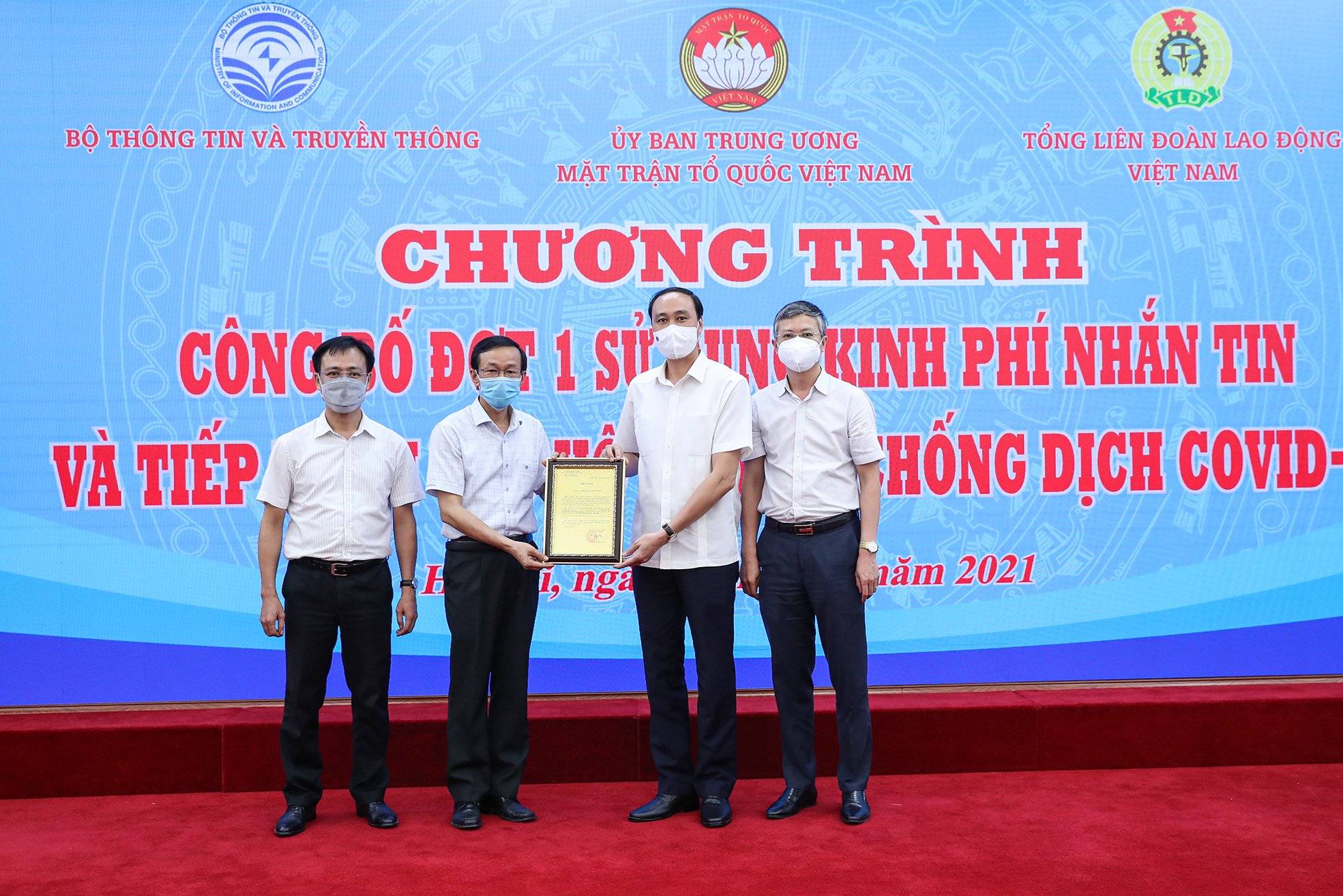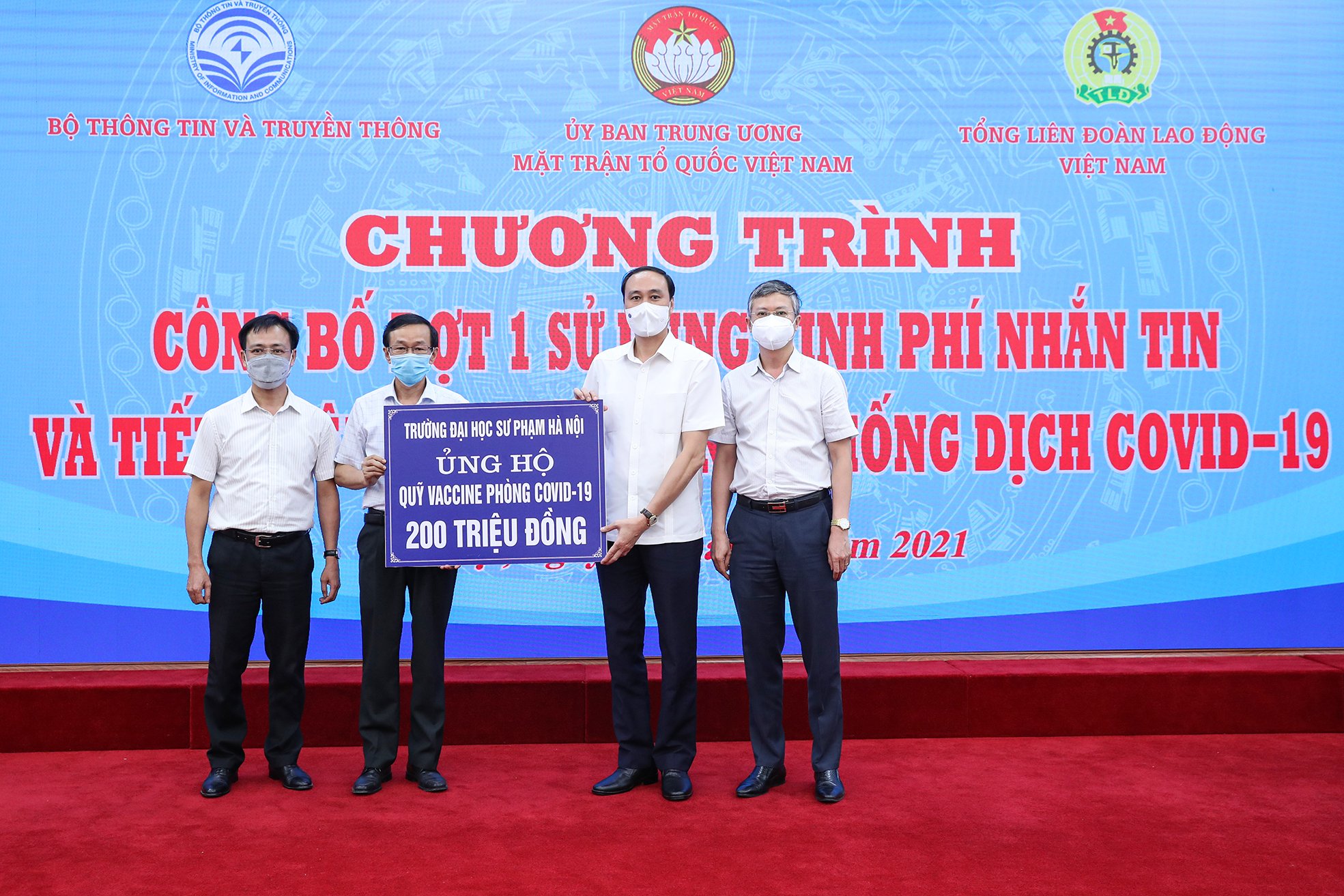 Chiều ngày 13/7/2021, tại Chương trình công bố đợt 1 sử dụng kinh phí nhắn tin và tiếp nhận ủng hộ phòng, chống dịch COVID-19 do Ủy ban Trung ương Mặt trận Tổ quốc Việt Nam, Tổng Liên đoàn Lao động Việt Nam và Bộ Thông tin Truyền thông đồng chủ trì tổ chức, GS.TS. Nguyễn Văn Minh - Hiệu trưởng Nhà trường đã tham dự và thay mặt toàn thể cán bộ, nhà giáo, người lao động, người học của Trường Đại học Sư phạm Hà Nội ủng hộ số tiền 200 triệu đồng cho Quỹ Vaccine phòng, chống dịch COVID-19.