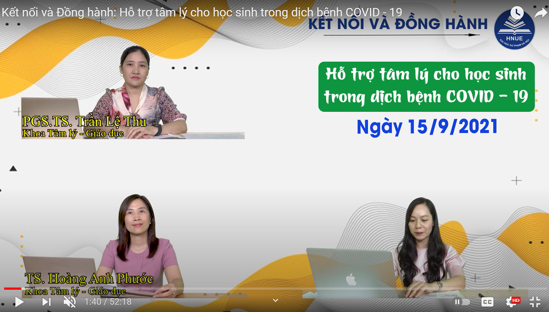 20h00 ngày 15/09/2021 Trường ĐHSP Hà Nội đã phát trực tuyến buổi chia sẻ, tư vấn với chủ đề: “Hỗ trợ tâm lí cho học sinh, sinh viên trong dịch bệnh COVID-19”. Buổi phát trực tiếp đã thu hút được sự quan tâm của đông đảo của các em học sinh, sinh viên, quý vị phụ huynh và thầy cô giáo với hơn 6300 lượt theo dõi trên Youtube và Facebook.