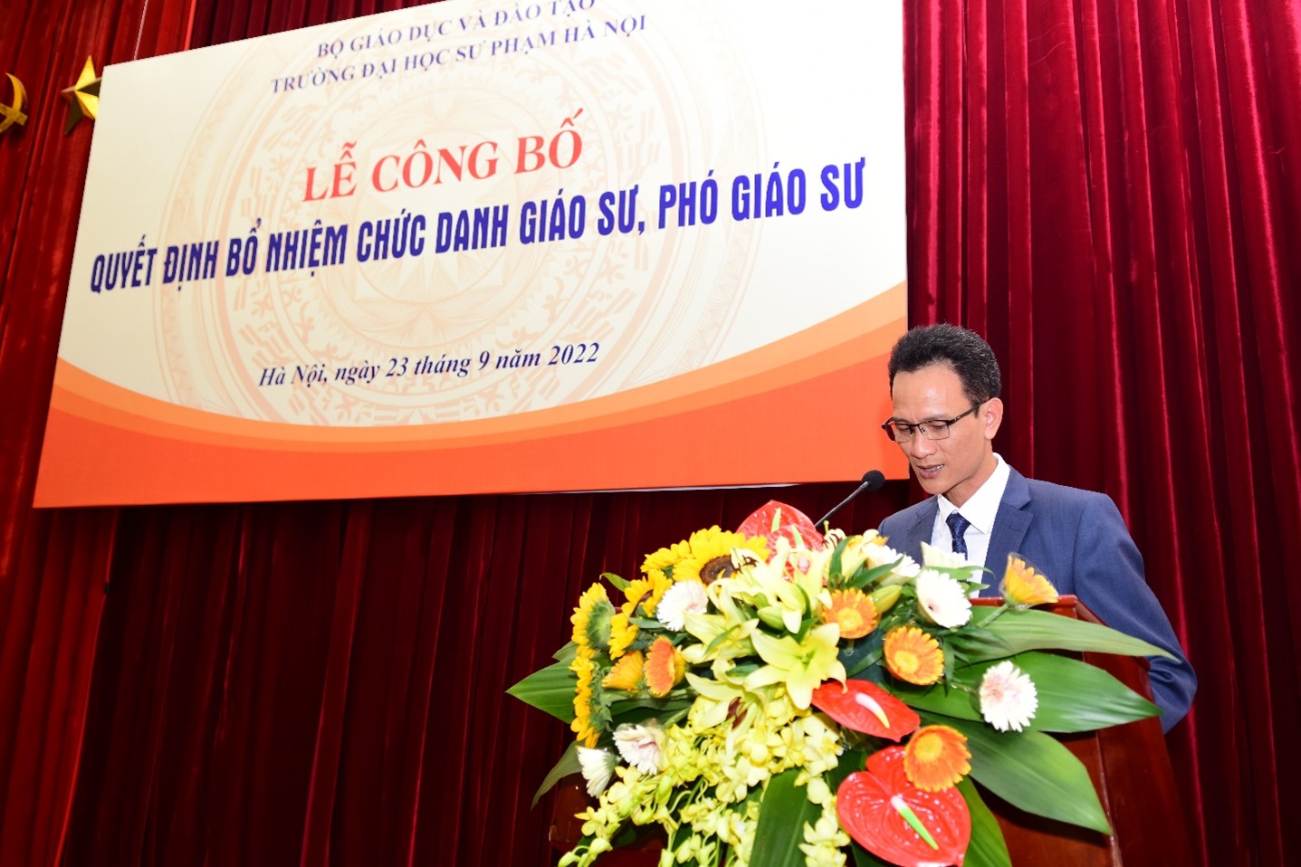 Thay mặt tập thể nhà giáo được bổ nhiệm, PGS.TS. Nguyễn Phúc Hưng bày tỏ niềm tự hào, sự xúc động trước những tình cảm, sự ủng hộ và tín nhiệm của Nhà trường, đồng thời gửi lời cảm ơn chân thành tới lãnh đạo Nhà trường cùng các nhà khoa học, các đồng nghiệp, gia đình và các em sinh viên đã hỗ trợ, động viên, tạo nhiều điều kiện thuận lợi trong quá trình công tác. PGS.TS. Nguyễn Phúc Hưng khẳng định đây là một vinh dự to lớn, không chỉ ghi nhận những thành tích của bản thân mỗi người trên chặng đường học tập, giảng dạy và nghiên cứu, mà còn là động lực thúc đẩy các tân Giáo sư, Phó giáo sư cố gắng và nỗ lực hơn nữa, thắp lên ngọn lửa đam mê và trí tuệ để hoàn thành những trọng trách và nhiệm vụ vẻ vang của sự nghiệp giáo dục đào tạo của đất nước, của Trường Đại học Sư phạm Hà Nội đã giao phó.