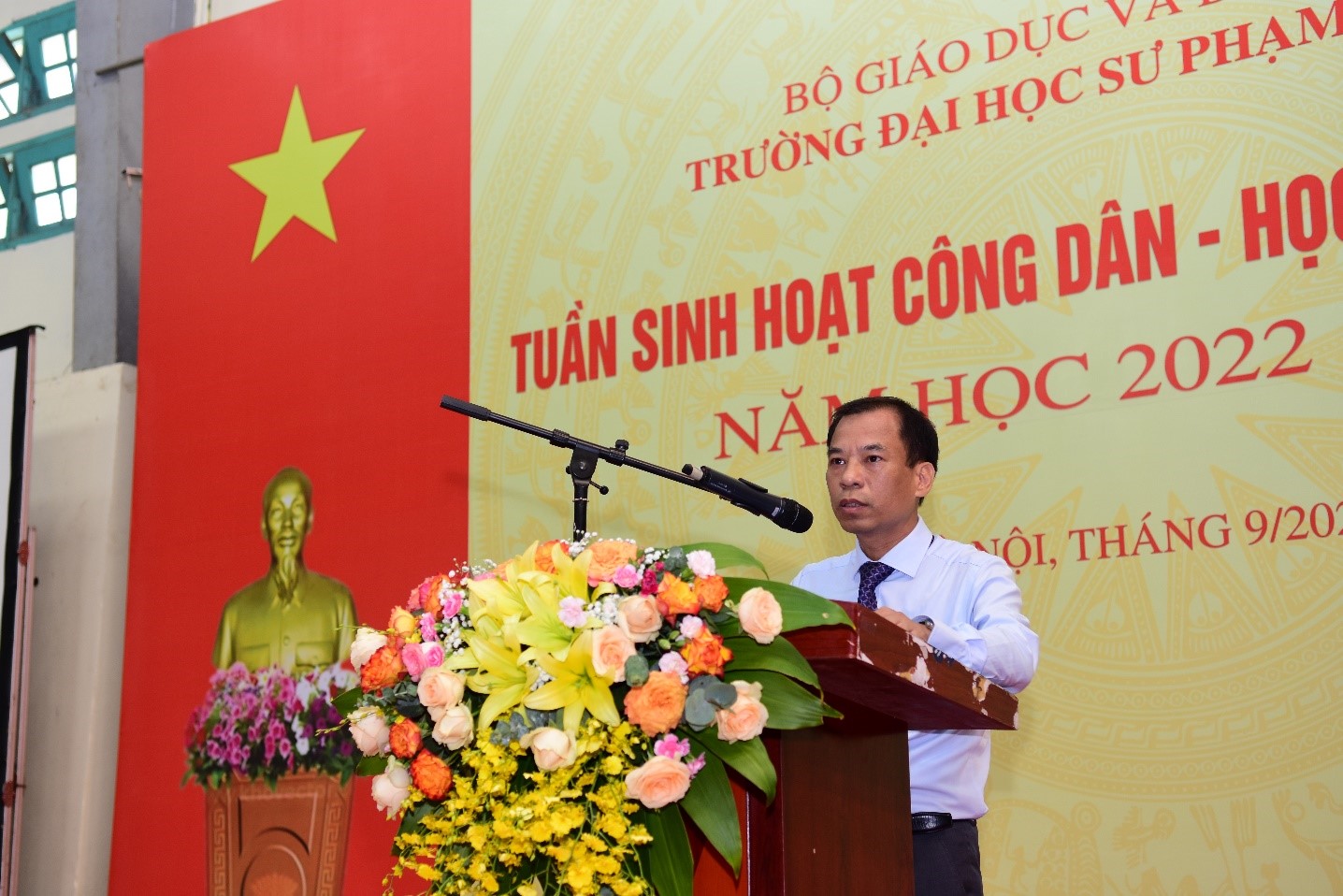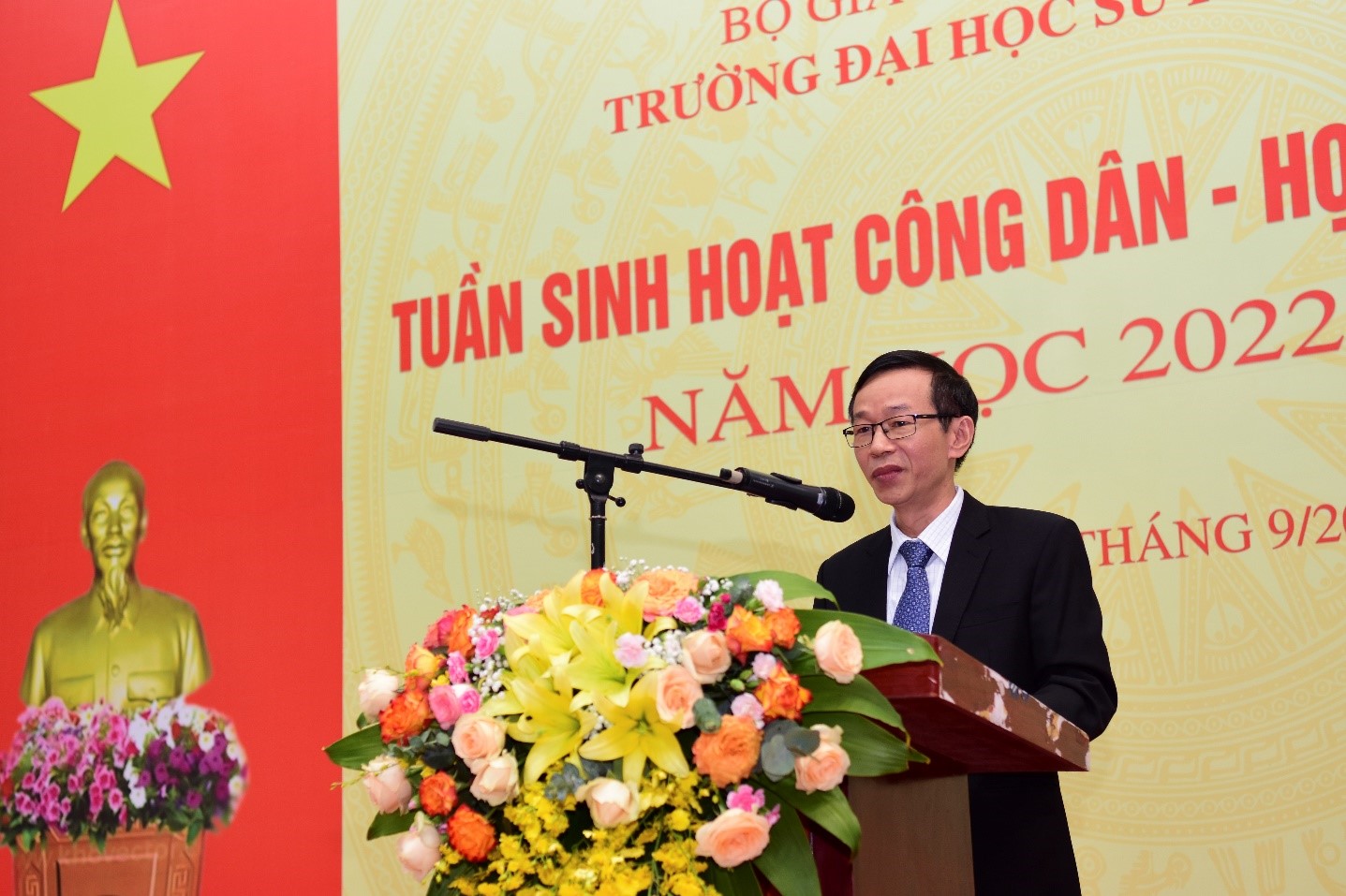 Phát biểu khai mạc Tuần sinh hoạt Công dân - HSSV năm học 2022 - 2023, PGS. TS. Nguyễn Văn Trào - Phó Hiệu trưởng Trường Đại học Sư phạm Hà Nội đã thay mặt lãnh đạo nhà trường nhiệt liệt chúc mừng các tân sinh viên K72 trở thành thành viên của trường. Thầy cũng bày tỏ sự tin tưởng đối với các em tân sinh viên khi các em đã có sự đúng đắn với lựa chọn khởi đầu xây dựng tương lai của mình tại ngôi trường Đại học Sư phạm Hà Nội – Ngôi trường với truyền thống hơn 70 năm xây dựng và phát triển, là cái nôi đào tạo nên đội ngũ cán bộ, giảng viên và các nhà khoa học có trình độ cao, tận tâm với sự nghiệp, có uy tín trong và ngoài nước.